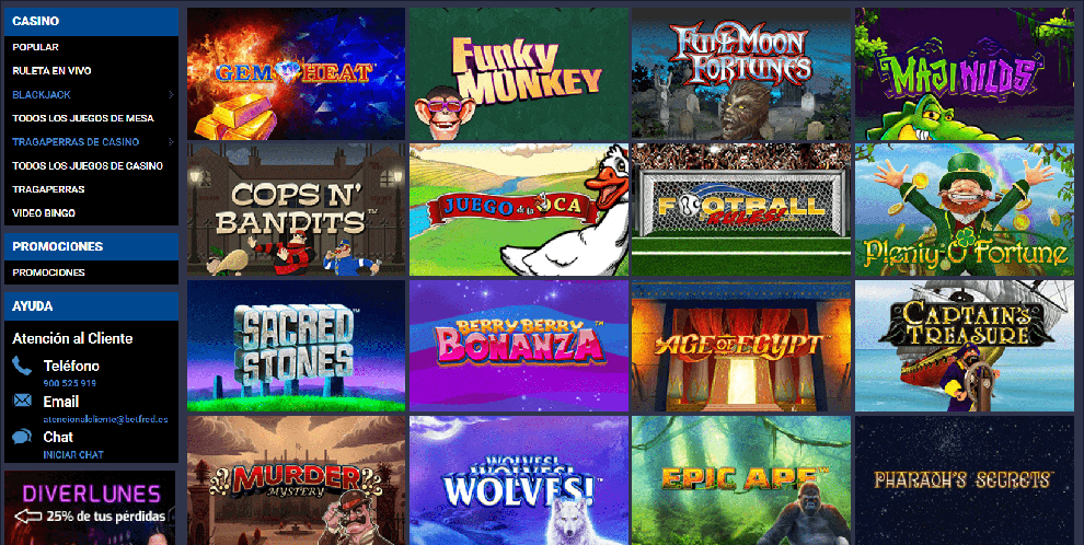 Bet Fred trabaja con excelentes proveedores como Playtech, Ash Gaming, WagerWorks y Boss Media. Por ello, cuando juegues en las tragaperras del sitio te sentirás completamente cautivado. Estas tienen gran calidad en gráficos animación que te darán una experiencia sensacional.